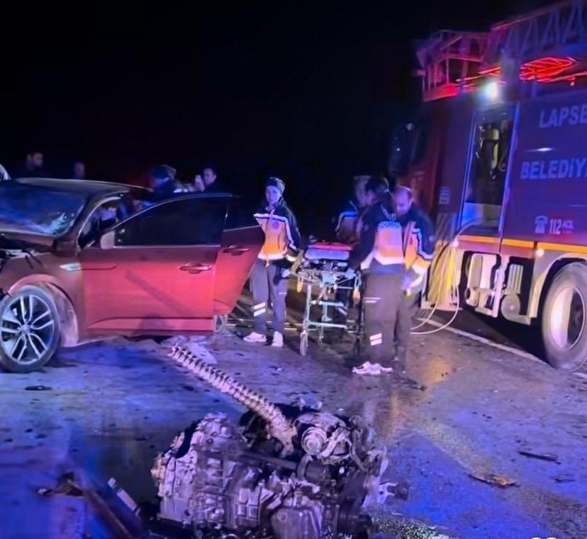 Polisle kovalamacaya giren otomobil Kangırlı sapağında ters yöne girip, o sırada Lapseki istikametinden gelen 17 LP 800 plakalı otomobile çarptı. Kazayı gören diğer sürücüler durumu 112 Acil sağlık ekiplerine bildirdi. İhbar üzerine olay yerine çok sayıda ambulans ve itfaiye ekibi sevk edildi.